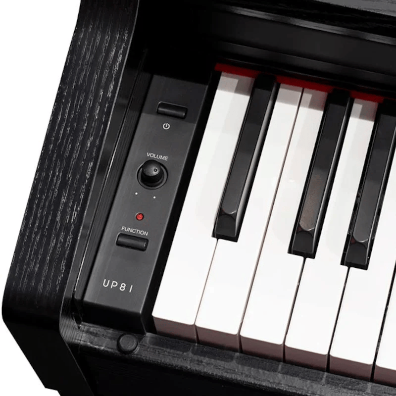 UP81, yüksek kaliteli seslerimizden bir seçkiyi, tam ağırlıklı kademeli aksiyon klavyesini (GAK) ve tam boyutlu, güçlü bir ses kabininde gerçekçi bir 3 pedallı üniteyi sunan, seçilebilecek en iyi giriş seviyesi dijital piyanodur. Klavye, bas tarafında ağır direnç ve tiz tarafında hafif direnç deneyimlemenize olanak tanıyan kademeli ağırlık bölgelerine sahiptir ve bu da pratik yapmanızı kolaylaştırır. USB-Audio'nun eklenen özelliği, performansınızı ekstra bir arayüze ihtiyaç duymadan doğrudan cep telefonuna veya bilgisayara kaydedebilme kolaylığı sağlar.