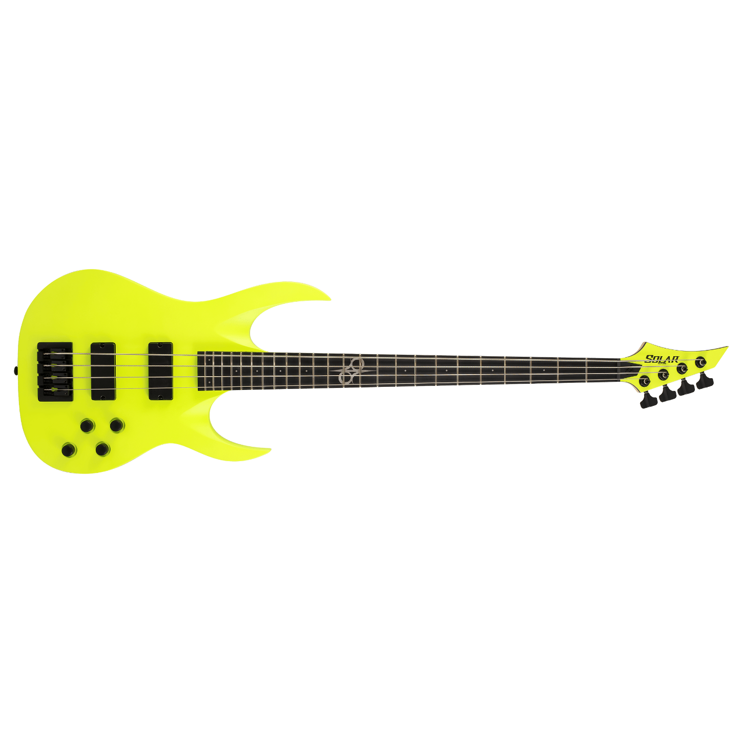 Bu Type AB2.4LN dört telli bas gitar, sade görünümü, belirgin cutaway oyuğu ve dikkat çekici özellikleriyle hem sahnede hem de stüdyoda kullanım için hassas ve profesyonel bir enstrümandır. Geliştirilmiş sustain sunan güvenilir, yüksek kütleli bir bas köprüsüyle donatılmıştır. Ayrıca iki adet Solar soapbar çift sargılı manyetik ve ses, denge, bas ve tiz kontrollerine sahip bir preamp sistemi içerir; bu sistem derin ve zengin bas frekansları ile güçlü orta tonlar sağlar. AB2.4LN modeli, doğal mat arka yüzeye sahip vidalı bir sapa, 34 inç skala uzunluğuna, alder gövdeye, hızlı ve rahat bir çalım sunan 5 parçalı maple/jatoba sapa ve rosewood klavyeye sahiptir. 24 süper jumbo perdeye ve küçük pozisyon işaretleyicilerine sahiptir. Solar 17:1 burgular, pps eşik ve siyah mat donanım ile tamamlanmıştır. Lemon neon mat kaplama ile sunulur. Not: 9V pil dahil değildir.