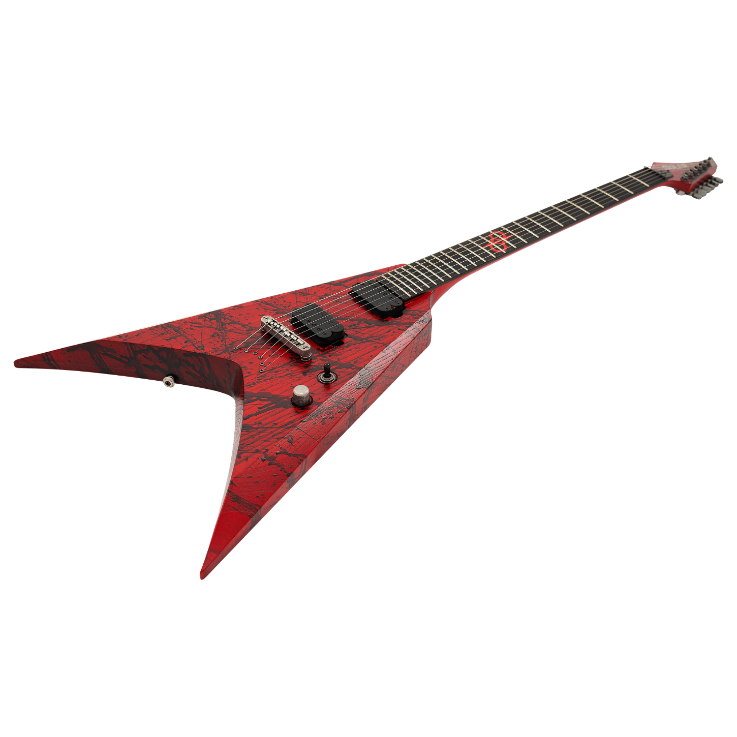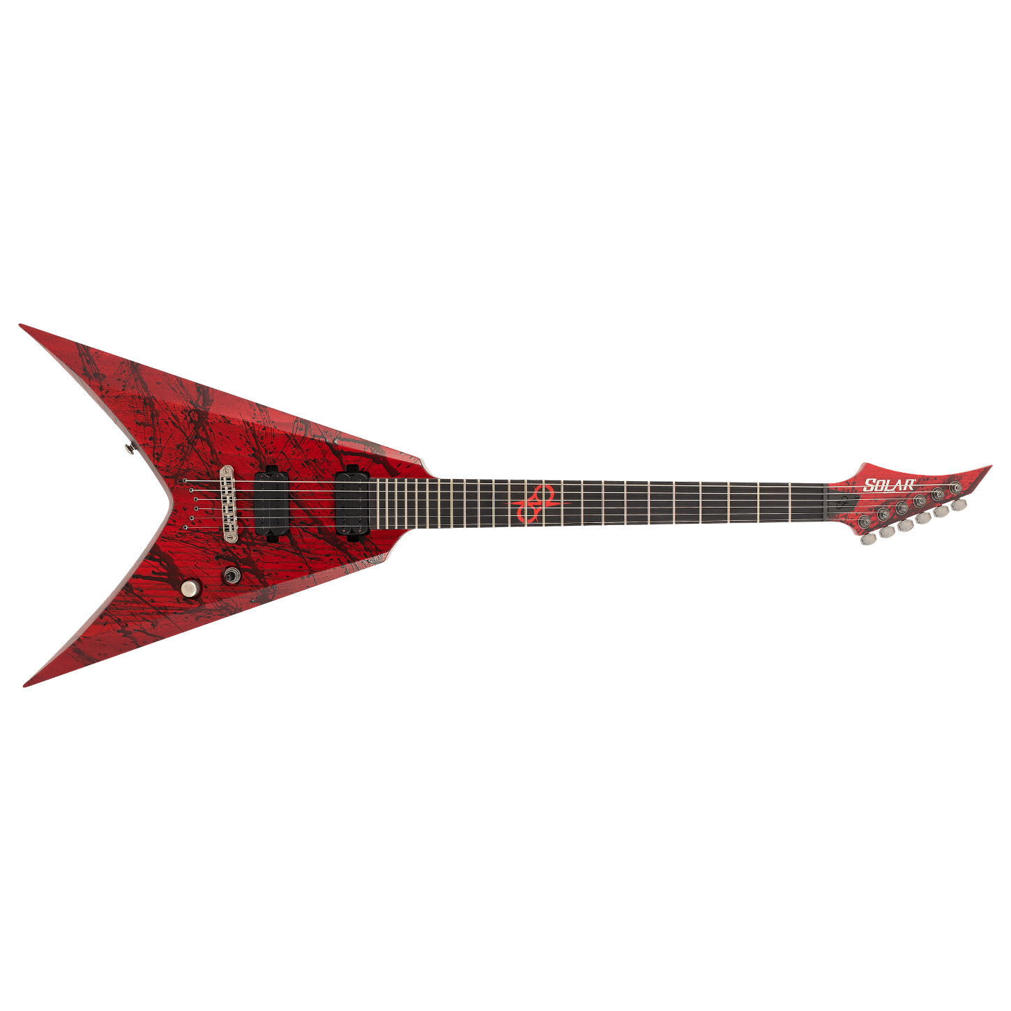 Bu Type V2.6CANIBALISMO+ gitar, sizi herkesten farklı kılacak. Kendine özgü, gizemli görünümü ve özellik seti ile bu gitar, sahne ve stüdyo çalışmaları için uygun, hassas ve profesyonel bir enstrümandır. Ayrıca, maksimum etki, sertlik ve agresyon için Alnico VIII mıknatıslarına sahip, yeni tasarlanmış Duncan Solar+ (Plus) yüksek kazançlı manyetikler ile donatılmıştır. Type V2.6CANIBALISMO+ gitar, 25.5" skala uzunluğuna sahip, set-thru neck/body bağlantı tasarımına, sungkai gövdesine, hızlı, ince ve konforlu maple sapa ve 24 süper-jumbo frete sahip rosewood perdetahtasına sahiptir. Ayrıca, Solar 18:1 akort makineleri, siyah mat donanım, PPS nut, 3 yollu toggle manyetik geçişi, push-pull ve tam erişim sapı da bulunmaktadır. Solar Type V deluxe çanta ile gönderilen bu gitar, trans blood red mat renk seçeneğiyle mevcuttur.